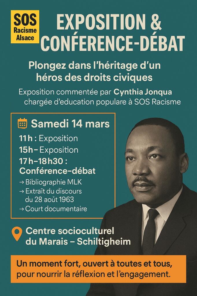 Exposition & conférence-débat organisées par SOS Racisme Alsace au centre socioculturel du Marais. Plongez dans l’histoire d’un héros des droits civiques et de la lutte antiraciste. Visite guidée de la galerie des tableaux par Cynthia Jonqua, chargée d’éducation populaire à SOS Racisme. Programme Samedi 14 mars • 11h : Exposition • 15h : Exposition • […]